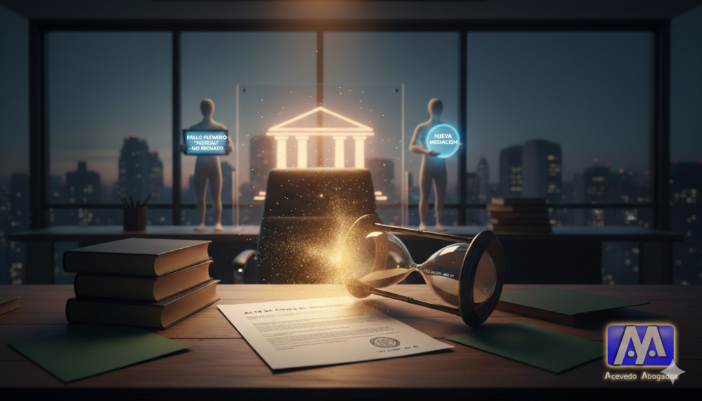 Como operadores del derecho y mediadores, celebramos que el Plenario «Aesseal» preserve el acceso a la justicia, impidiendo que un error en los plazos aniquile el derecho del cliente. Sin embargo, la directriz es clara: el acta de cierre tiene fecha de perención. Pasado el año, el trabajo realizado en la mesa de mediación se «evapora» procesalmente, obligándonos a reiniciar el camino para habilitar la instancia judicial.
